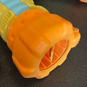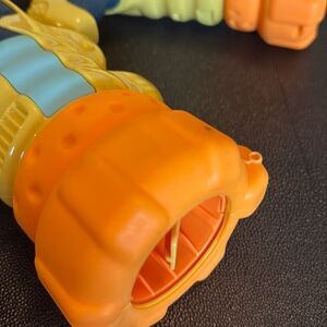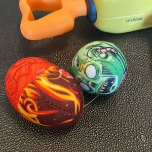 These vibrant blue and orange foam ball launchers are perfect for imaginative play. Designed as action figures, they feature a unique spiral pattern on the green foam projectiles. Ideal for exciting playtime adventures.