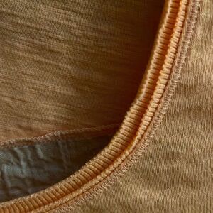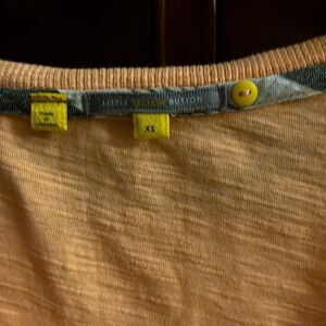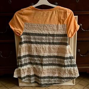Little Yellow Button orange cotton top w plaid linen back. High low hem with adjustable ties to gather the hem. NWOT XS. Double layer collar, super soft cotton