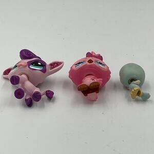 - 3 Littlest Pet Shop figures (pink owl, sparkle violet cow, teal parakeet)