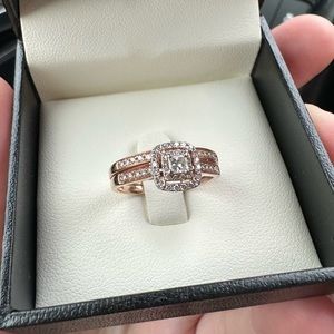 This rose gold engagement/band set is like new and missing no diamonds. 10 karrat. Sized to 8, and the two rings are lightly soldered together. Could be easily taken to a jewelers have them separated!
