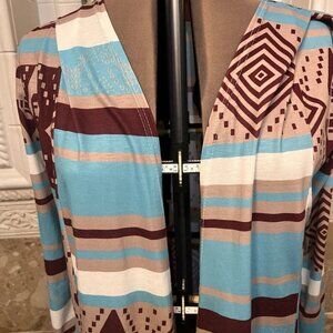 Liu Si Ran. Size Large. Stretch Kimono. Cardigan. Open front . Border Print Stripe. Asymmetrical - longer in back. Shoulder to hem in front 30". Sleeve 24.5". Bust 21/42". Southwest. Machine wash.