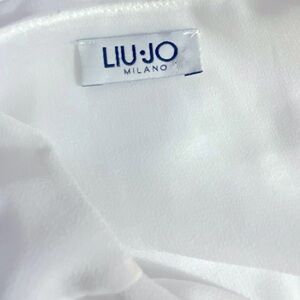 Liu-Jo Amaryll Mini Ruffle Flounce Lace Dress with ruffle details, mini logo on back, ruffle, V-neck, sleeveless, flounce hem, pull over style, ruffles and lace on front chest and around the neck to the back of the neck, two lace panels on front bottom half of the dress, elastic semi wide waistband, lined on the bottom half of the dress.