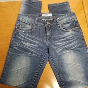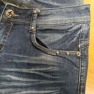 Liuce's size 7 blue jeans. Has whiskers on front and back under knee. Embellished pockets both front and back. Measures 30 waist, 8 rise, 31 inseam