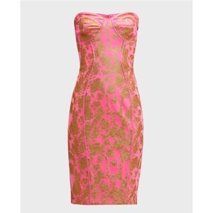 Liv Foster Strapless Bodycon Midi Dress Pink Gold Jacquard Stretch Size 10