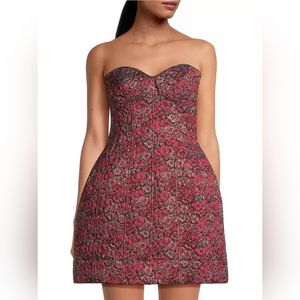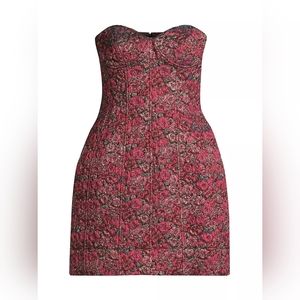 Liv Foster’s minidress is designed in a formfitting silhouette with an allover floral jacquard.