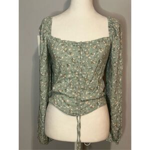 Super cute top with front ruching that can be tied to make the front short or long. Smocking on back. Elastic cuffs.