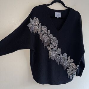 Liv Milano Black Evening Sweater L Top Floral Metallic Beading Knit Lightweight
