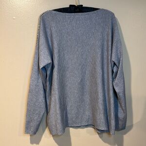 Liv Milano Grey sweater with open weave lattice. Silver accents on sleeve. Extra soft material. Light weight with slight dolman sleeve and boat neck. This is a beautiful sweater! Excellent condition.