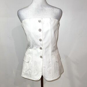 NWT Fits small, order up Designed for a slim fit Straight neck Sleeveless Back zip closure Jewelry buttons, pleats Two flap pockets Lined Imported Main material: 68% viscose/32% linen; lining: 100% viscose; mesh: 82% polyamide/18% elastane Dry clean This top runs small more like a size S BYB 600