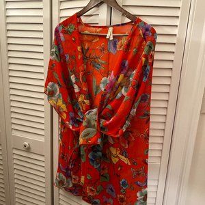 Live 4 Truth asymmetric Kimono, orange red floral designs, shoulder to bottom hem 33", size 2X. Versatile piece, can be worn with front bow (pictured) or relaxed