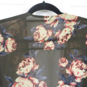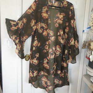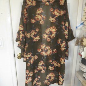 A beautiful top. Kimono top from Live 4 Truth. A nice Sage green with fun flowers. Sleeves are great with a ruffle detail.The front is shorter than the back. Tried hard to show detail. Yoke bodice back. Sleeves measure 23 inches from top of the shoulder to the base of the ruffle. The back measures 46 inches from the top of the back neckline to the base of the top.