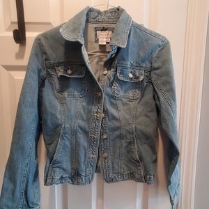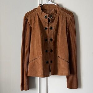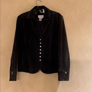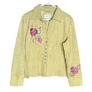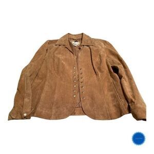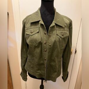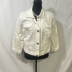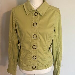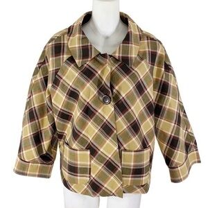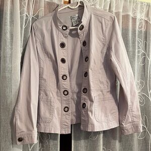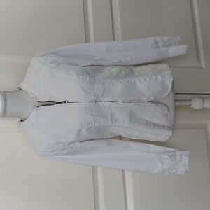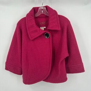 Light and breathable short sleeve jacket by LAL with a half sleeve and oversized collar. Buttons on the back bottom and on the sleeves to cinch them in. Full front zip and two front pockets. A few minor snags; see photos. Please see all pictures before purchasing; measurements are below.