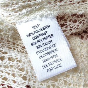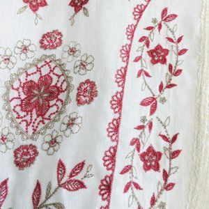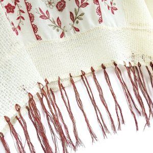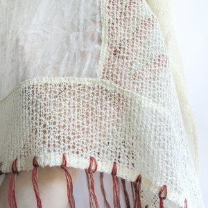 With exotic Asian inspired floral embroidery and contrasting fringe trim, this airy knitted pullover would also be great as a swim cover-up at the beach.