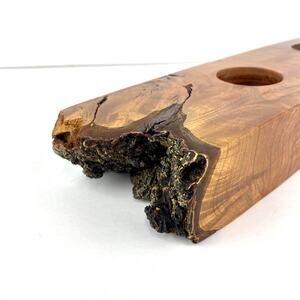 Beautiful grain in this cut of wood with live edge. Finished with a high gloss, has 2 tea light recesses. Measures 14" x 3.5". There is an engraving on the bottom dated June 2017.
