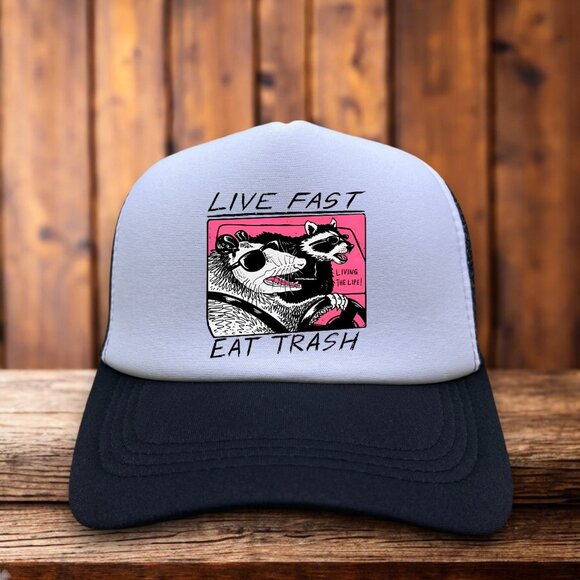 Live Fast Eat Trash Unisex Trucker Hat Black Raccoon Possum Funny Baseball Cap