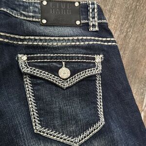 Live Hard Play Hard Design Silver Rhinestone Bootcut Mid-Rise Jeans Sz 30 L 36