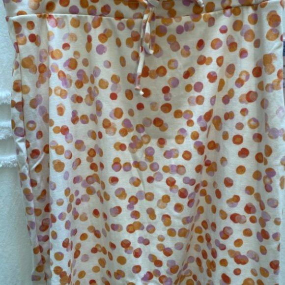 Sot stretchy knit fabric, wide waistband with drawstring, alight scooped size hem, white with orange polka dot.