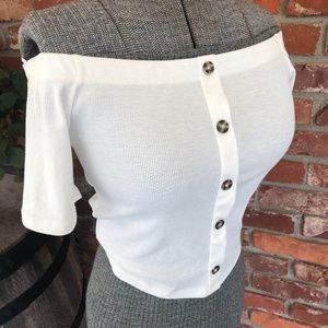 Short sleeve off the shoulder top with buttons down the front. Buttons are sewn on. Cream/off-white in color. NWT