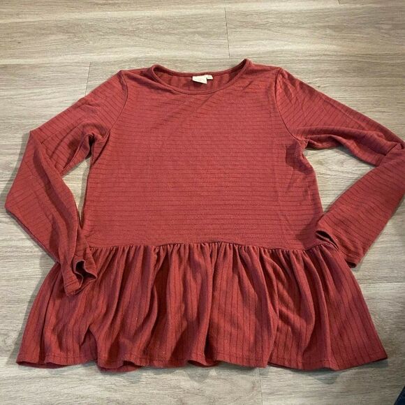 Live In The Moment Womens Burgundy Striped Ruffle Long Sleeve Blouse Top Small