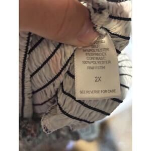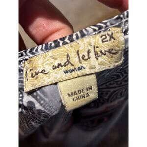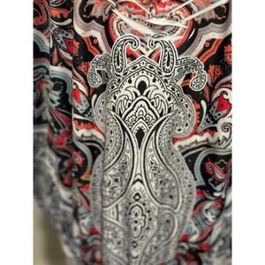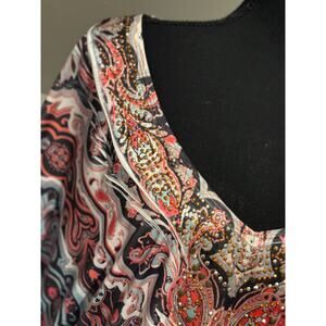 Preowned in excellent condition and perfect for your next adventure to the casino, cruise or party! Add a touch of vintage charm to your wardrobe with this Live & Let Live v neck flutter sleeve top. The top features a beautiful paisley pattern in a colorful palette of red, cream, black, and gray. The V-neckline is adorned with pleated and studded accents, along with red, brown, and gold beads/studs giving it a unique and bohemian look. Made of lightweight knit fabric, this tunic-style blouse is perfect for any casual occasion, whether it's a day at the beach or a retro-themed party. The flutter sleeves add a touch of femininity, while the pullover closure ensures a comfortable and easy fit. This top is available in size 2XL and is perfect for those who love beachy, rocky, and colorful styles.