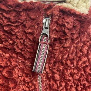 This sherpa pullover blends style and warmth, offering a soft fleece texture and a convenient 1/4 zip design. Its rust red color adds a chic touch to your casual look while ensuring comfort during chilly days. Super soft deep-pile material. Straight Sides. Quarter zip closure with multi-color embroidered pull-tab. Contrast lined stand-up collar. Side pockets, in line with side-seam.