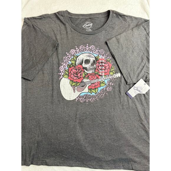 This gray short-sleeved shirt features a skull, guitar, and roses graphic.