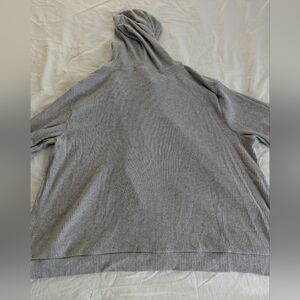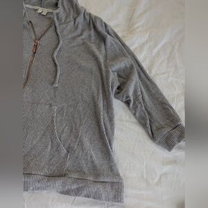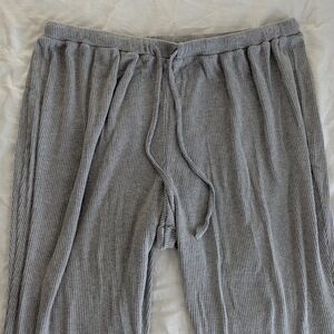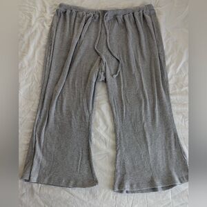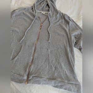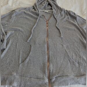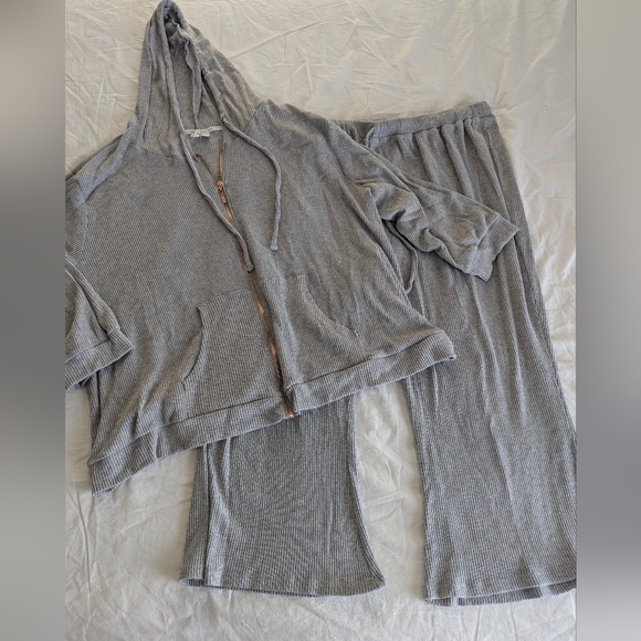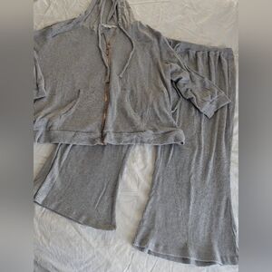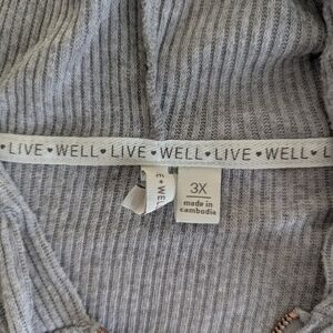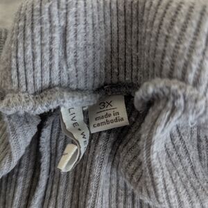 Live Well Ribbed Lounge Set, 3X. Jacket is hooded w/ drawstring ties, full-zip, kangaroo pockets, quarter sleeve, loose fitting hem, ribbed edges, lightweight (28.5' pit to pit, 31' across hem, 25' length). The pants have an oversized/wide leg fit, elastic waist w/ drawstring ties, lightweight, no pockets (34' full length, 23' inseam, 21' across waist).