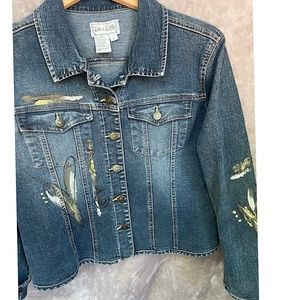 🎉Live a Little, Hand Painted Denim Jacket, Size Large, Blue. Unique, original hand painted denim jean jacket featuring painted hearts on front, back and left sleeve. Two functional front flap button closure pockets, curved & slightly flared hem and front button closure. Good Condition, Smoke Free & Pet Free Home.