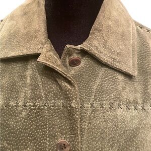 Olive green, 100% leather, Live a Little woman’s suede jacket with sweater sleeves. This jacket has been loved but the suede is in excellent condition. The sweater sleeves have some pilling. The collar has discoloration at the back of the neck as shown in last photo. Unless you have short hair this wouldn't be noticeable. It does not take away from the jacket. Size small.