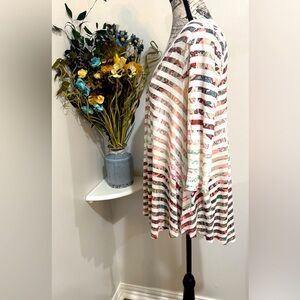 Elevate your wardrobe with this stunning Live and Let Live tunic. Featuring a chic striped design in shades of red, cream, and green, this piece is perfect for any casual occasion. The lace back adds a touch of elegance, while the copper metal embellishments provide a hint of sparkle.