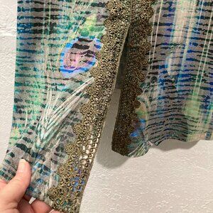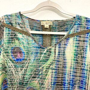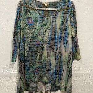 Live and Let Live Women Tunic Top Crochet Split Back 3/4 Sleeve Peacock Green 1X