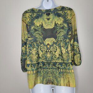 Live and Let Live yellow blue grunge boho art to wear 3/4 sleeve top size large