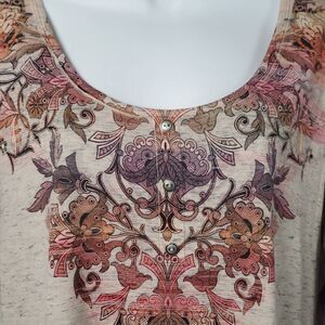 Add a touch of boho-chic to your wardrobe with this Live and Let Live women's top in size XL. This soft beige tunic-style top features an intricate multicolor embroidered floral pattern across the chest with rhinestone accents, lace patch elbow detailing, and long sleeves. Made from a stretchy, lightweight poly-spandex blend, it’s perfect for casual wear with a comfortable fit and flattering scoop neckline.