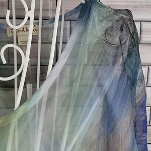 A watercolor sheer polyester with and artsy print shawl by Live and let Live. A beautiful feminine piece that would brighten up any outfit. A relaxed fit but an overall small silhouette on this shawl.