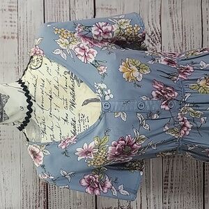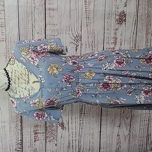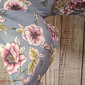 Beautiful dusty blue v neck and back with tie. Elastic waist with flounce sleeve. Pre-owned in great condition. No damage. Size L but more like S/M