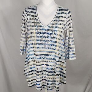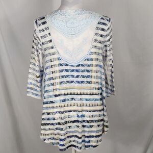 This blue and white Live and Let Live 3/4 sleeve Rhinestone studded blouse is a size Small with a pit to pit measuring 19". It has floral lace and crocheting on back. 50% polyester 50% rayon exclusive of decoration and machine washable. Pre-owned and in excellent condition. All offers welcome.