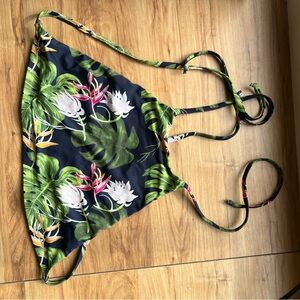 Vibrant tropical print bikini top by Lively. Features lush green leaves and colorful flowers on a black background. Adjustable straps for a perfect fit. Pristine condition, only worn a few times.