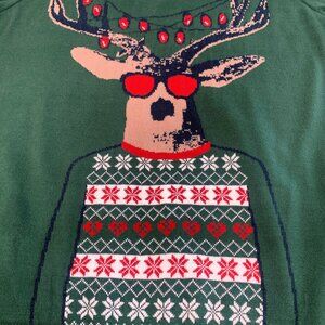 The Livergy US Size L 42/44 Cool Reindeer Ugly Christmas Sweater is a lightweight sweater perfect for the winter season. This acrylic knit sweater features a tight-knit design with a crew neck and long sleeves. The green sweater is adorned with a festive Christmas theme, making it ideal for casual occasions. With a regular fit and pullover style, this sweater is both comfortable and stylish, ideal for men looking to add a touch of holiday cheer to their wardrobe.