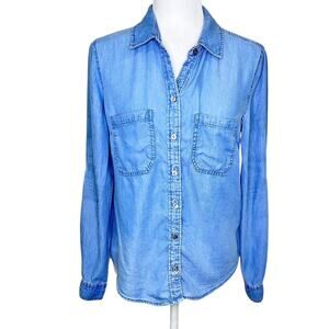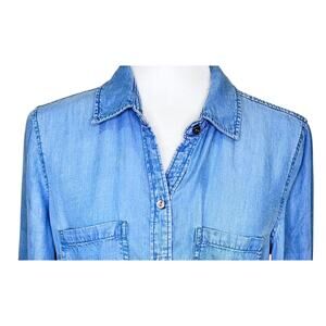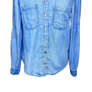 Liverpool 100% Lyocell Chambray Denim Button Down Long Sleeve Button Tab Shirt. Two front patch pockets. Lightweight soft comfortable. Size Small. Measurements taken flat: