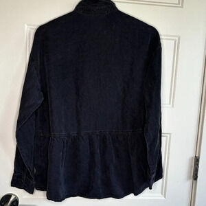 This is a universal black button up blouse with a skirt waist. It looks great when it’s opened up as a jacket with a top underneath as pictured or can be used as a regular top.