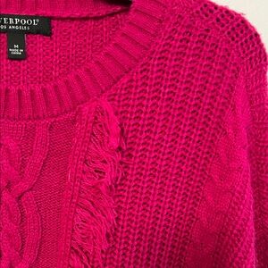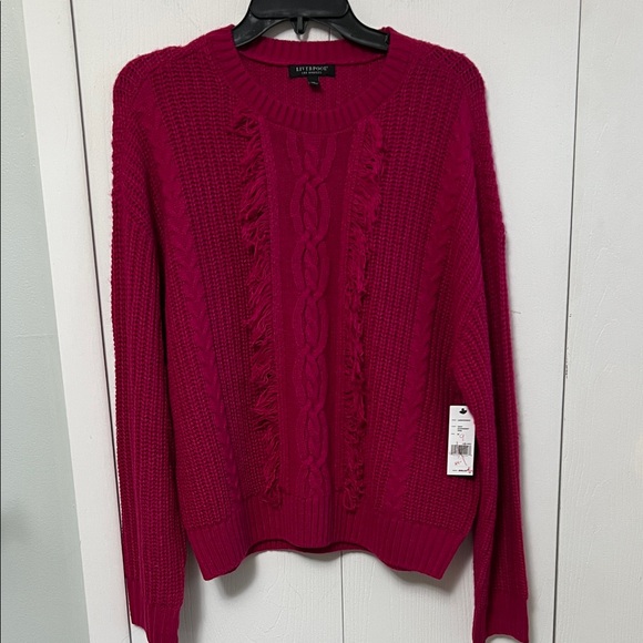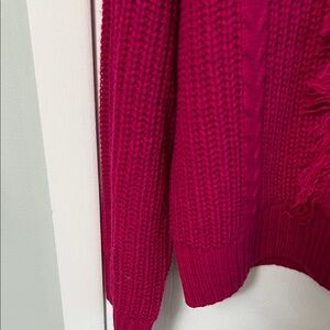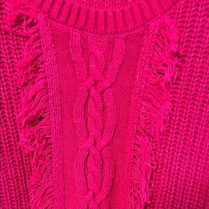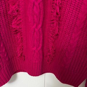 Cable-knit crewneck with textured panels and subtle fringe down the front. Long sleeves with ribbed cuffs and hem. Vibrant raspberry color for standout layering.