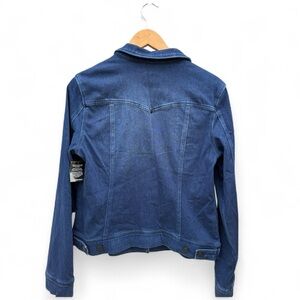 The product is a classic jean jacket made with Powerflex material. This is a dark super starchy material. Really soft fabric and very comfortable. New, never worn but very pretty.