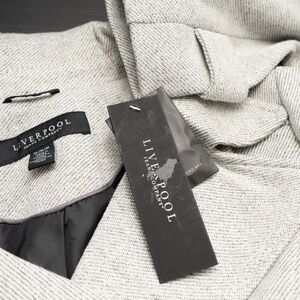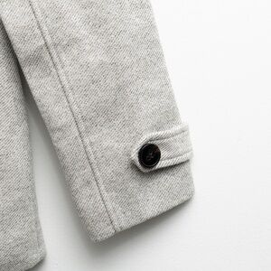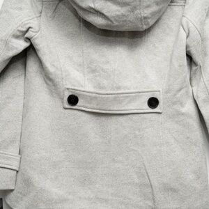 This Liverpool peacoat is a lighter-weight winter layer with a classic double-breasted silhouette and a soft, heather-grey textured fabric. It’s fully lined for comfort and warmth without the bulk, making it great for milder winter days or layering over sweaters.The coat features a detachable hood, black button detailing, angled side pockets, and a back button-tab accent for a polished, structured look.
