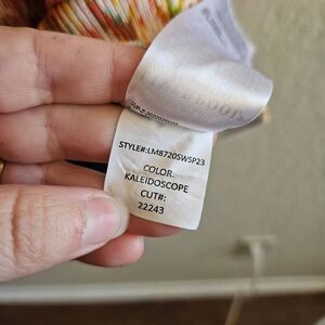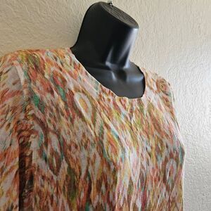 This is a long sleeved top by Liverpool. The print name is Kaleidoscope and it features tan, blue, green, red, and yellow hues.