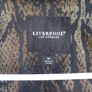 This Liverpool Los Angeles blazer jacket is a size M with a trendy animal print design, suitable for casual, business, or travel occasions. The jacket features a faux leather collar and long sleeves, with a regular length. Made of polyester, spandex, and viscose in a knit fabric, this multicolor blazer does not have buttons on the sleeves or front. Perfect for the winter, fall, or spring seasons, this one-piece jacket from a reputable brand is brand new without tags.