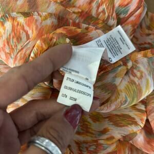 Liverpool Los Angeles sleeveless shirred tie-front blouse in a beautiful orange, blue, and cream colorway. Made of sheer polyester with a keyhole detail, this pullover top is new with tags (NWT) and perfect for a breezy, layered look.