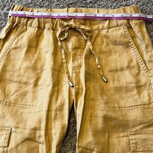 Comfy drawstring linen cargo pants in mustard yellow. Wide leg, cropped pants. Only worn 2-3 times. Very minor wear from washing once.