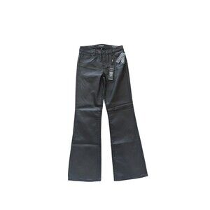 This Liverpool Women's Size 6 Black Stretch Denim Mid-Rise Lucy Bootcut Jeans feature a solid black color with a charcoal wash, crafted from a cotton blend fabric with a denim texture. The jeans have a mid-rise fit, a bootcut style, and a 32-inch inseam. Designed with a 5-pocket design, these jeans include accents like a logo and provide stretch for comfort. Ideal for the winter and fall seasons, this modern piece embodies a punk, grunge, city, and classic theme, making it a versatile addition to a woman's wardrobe.