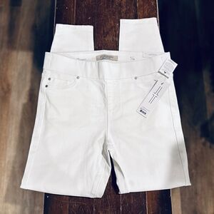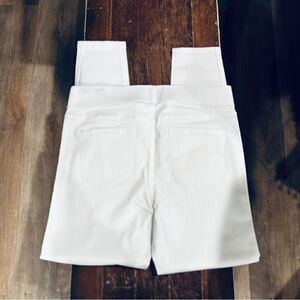 Size 6/28 | White | 67% Cotton, 25% Rayon, 7% Polyester, 1% Spandex | 28" Inseam, Mid-rise 10" Front rise, 9-3/4" Leg opening | Amazing stretch and comfort | Elastic waistband does not bunch or twist | Faux front pockets, functional back pockets |