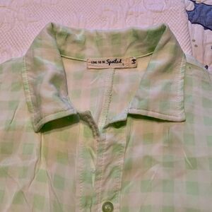 Live to be spoiled green gingham shirt. Very light and soft. Size L. Perfect for summer. Wear alone or as a cover over a tank top.